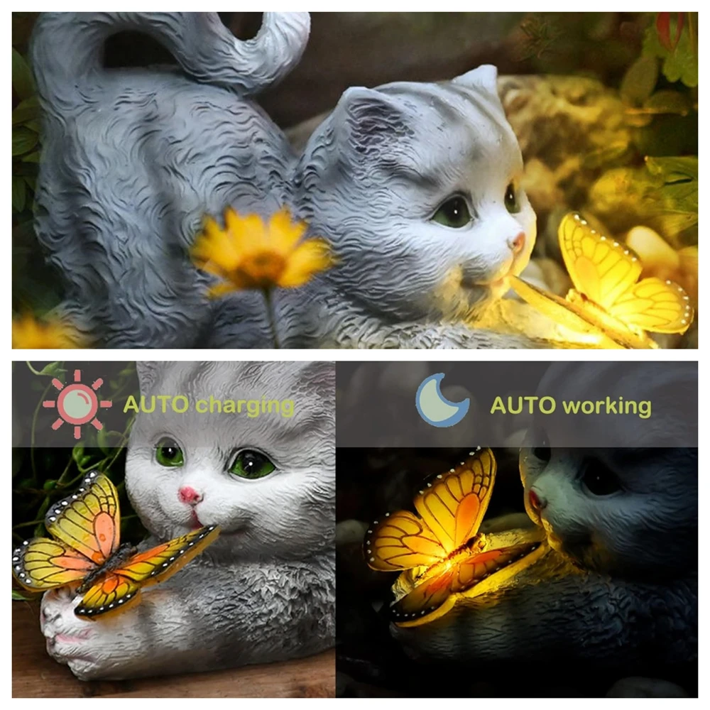 Solar Garden Statue Light Cat Garden Figurine Outdoor Decoration with Cat Holding Butterfly for Yard,Patio,Lawn Art Decoration