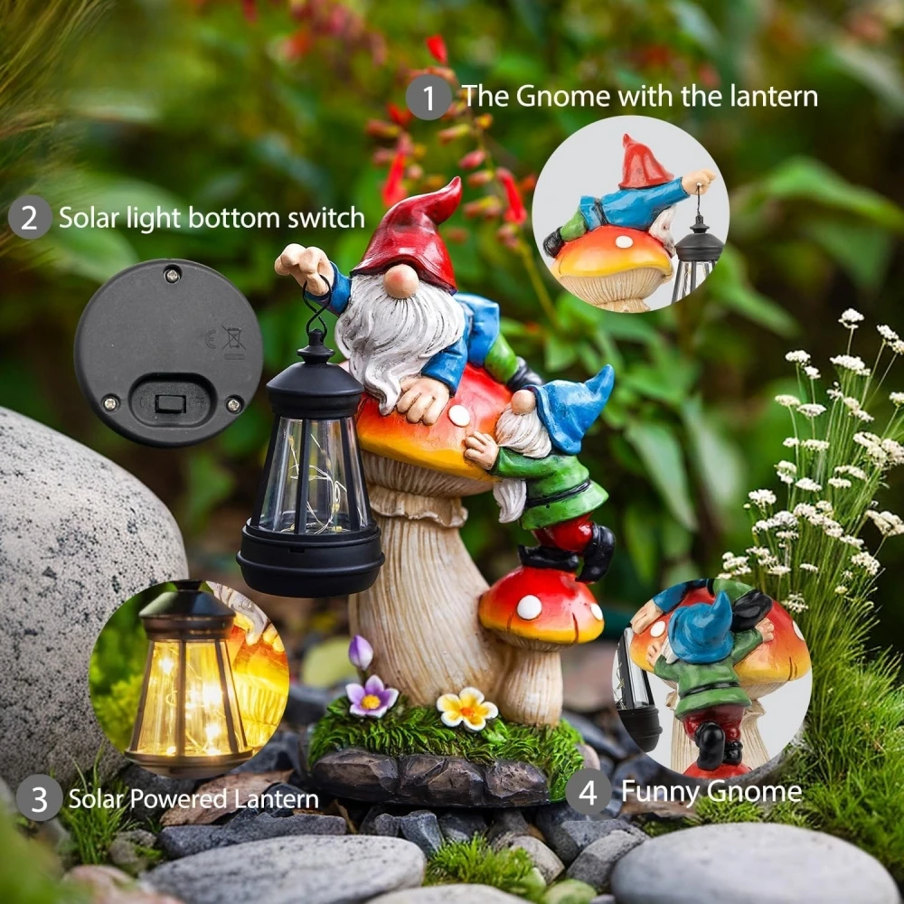 Great Material & Weather Proof:Garden gnome decorative lights will accompany you for a long time and give you a lot of fun. Our fairy garden accessories yard decor are made of high quality resin material, waterproof, cracking and fade resistant could work well even in heavy rain or snowstorms.