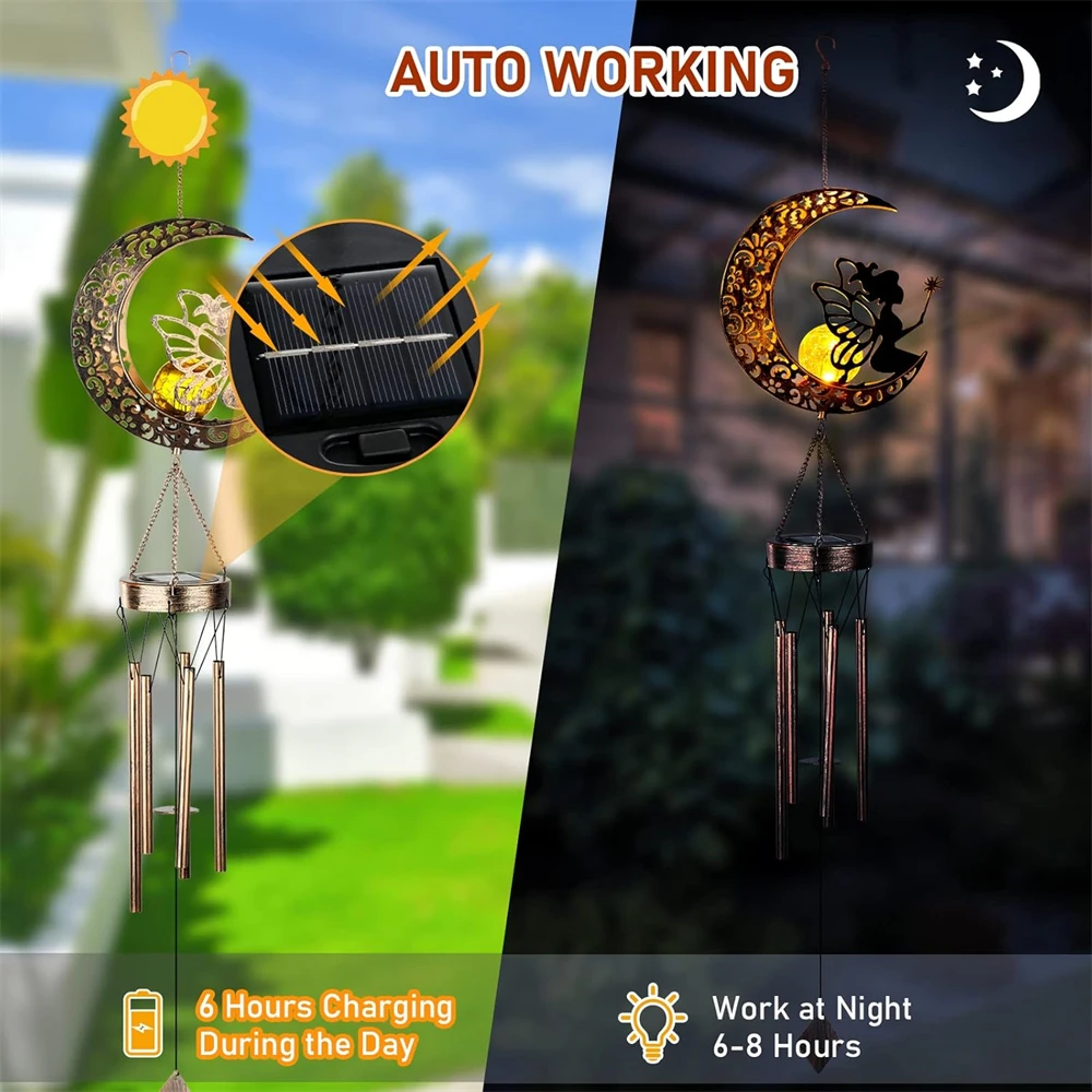 1.SOLAR LIGHTS FAIRY MOON AUTOMATIC ON/OFF:This solar fairy moon lights wind chime features built-in photosensitive components that automatically control brightness. It illuminates for 8 hours at night when fully charged, turns off automatically at sunrise, and charges during the day using sunlight.
